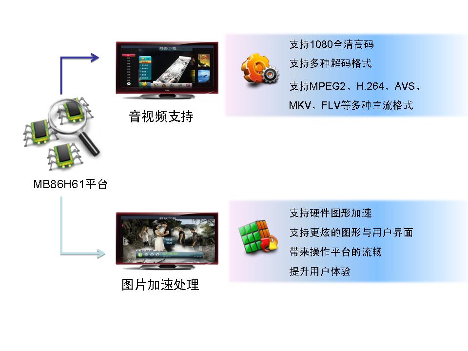 MB86H61系列芯片基于多核CPU架構(gòu),內(nèi)部集成了富士通獨(dú)有專(zhuān)利技術(shù)的硬件視頻處理器視頻解碼單元解碼全高清/標(biāo)清MPEG-2、H.264、VC-1、AVS、FLV、MKV等多種視頻格式,而音頻解碼單元?jiǎng)t采用高性能的ARC725TM(594DMIPS)支持DD、DD+、AAC、DRA等多種先進(jìn)音頻格式。因此,該芯片的ARM11內(nèi)核主CPU將全部用于處理應(yīng)用程序,其性能將有足夠的裕量,能充分保證系統(tǒng)運(yùn)行的平穩(wěn)流暢。“獨(dú)立的硬件圖形加速功能還使其能更輕松地支持豐富的圖形用戶(hù)界面、高清圖片顯示,從而大大提升用戶(hù)體驗(yàn)。”富士通半導(dǎo)體業(yè)務(wù)發(fā)展總監(jiān)黃自力表示,“該芯片對(duì)于全高清AVS視頻解碼的支持尤其值得一提,目前市場(chǎng)上大部分的高清芯片所能支持的AVS解碼還停留在標(biāo)清階段。”