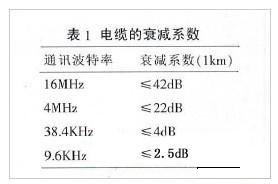 導線的電阻對信號的影響很小,可以忽略不計。電纜的分布電容C主要是由雙絞線的兩條平行導線產生。信號的損失主要是由于電纜的分布電容和分布電感組成的LC低通濾波器。通訊波特率越高,信號衰減也會越大。常規(guī)電纜的衰減系數見表1。