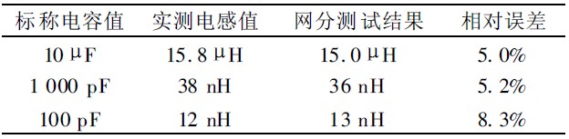 使用網(wǎng)絡(luò)分析儀測量寄生電感的方法為: 測量待測電容并聯(lián)情況下的正向傳輸曲線, 得到如圖1 所示的曲線, 讀出陷波點頻率, 并根據(jù)式(1) 計算出寄生電感值。表1 顯示了使用文中描述的測試儀測量的3 種數(shù)量級的電容器寄生電感的結(jié)果與采用網(wǎng)絡(luò)分析儀測量結(jié)果的對比情況, 表1中所示結(jié)果為多次測量取平均值之后的最終結(jié)果。