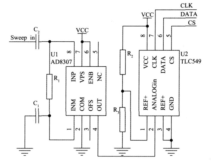 諧振點檢測電路主要由檢波器和AD 轉(zhuǎn)換器組成, 其中常用的檢波器有峰值檢波器、有效值檢波器和對數(shù)檢波器。由于這里的檢波只是為了檢測出諧振點, 因此對檢波器的種類沒有特殊要求, 這里采用AD8307 這款寬帶對數(shù)檢波器。A D8307 可以實現(xiàn)DC 500 MH z 頻率范圍內(nèi)的對數(shù)檢波器, 其輸出為直流電壓, 輸出與輸入功率( 以dBm為單位) 呈線性關(guān)系。