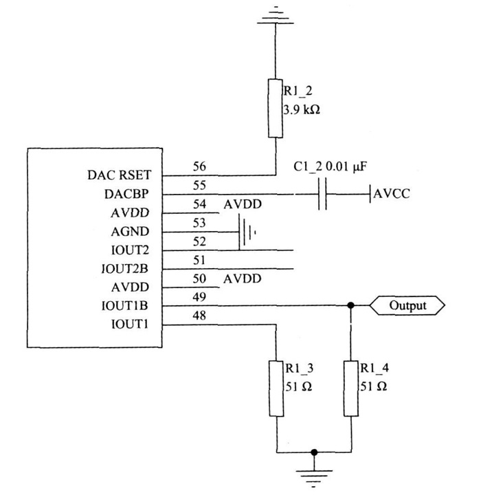 掃頻發(fā)生器在本系統(tǒng)中產(chǎn)生寬頻帶掃頻信號以激勵待測電容, 當電容較大時,以常見的電解電容為例,假設(shè)電容為1 000 F, 其寄生電感為100 nH, 則按照式(1)可計算出其自諧振頻率為15. 9 kHz, 諧振頻率較低;另以瓷片電容為例, 假設(shè)其電容值為10 pF, 寄生電感約為10 nH, 則其自諧振頻率為500 MHz 這兩個信號頻率相差了4 個數(shù)量級, 這就需要1 個寬帶的信號發(fā)生器, 這也是本部分的設(shè)計難點所在。若采用傳統(tǒng)的模擬信號發(fā)生的方法, 為了實現(xiàn)信號頻率的可調(diào), 一般會采用變?nèi)荻O管構(gòu)成的LC 振蕩器, 然而在信號頻率較低時, 所需要的變?nèi)荻O管的電容量會很大,而傳統(tǒng)的變?nèi)荻O管電容值一般只是幾個pF 至幾百pF ,很難滿足低頻振蕩要求。為了簡化掃頻電路, 以及實現(xiàn)數(shù)字化控制, 這里采用DDS 技術(shù)產(chǎn)生寬帶信號。DDS 采用的是DA 轉(zhuǎn)換器的原理, 通過計數(shù)器累加實現(xiàn)的連續(xù)波形輸出 , 而DDS 芯片外圍電路簡單, 通過寫它的寄存器便可實現(xiàn)信號頻率的調(diào)節(jié), 同時產(chǎn)生的信號頻率分辨率高,一般可以達到0. 01 Hz 級別, 信號頻率的跨度大, 可以實現(xiàn)從幾Hz 到幾百MHz 的連續(xù)信號, 非常適合做掃頻發(fā)生器。這里采用了AD9854 這款DDS 芯片, 它在300 MHz 時鐘驅(qū)動下, 按照乃奎斯特采樣定律可以產(chǎn)生最高150 MHz 的信號,為了得到信號較好的頻率則一般只得到最高100 MHz 的信號。若要得到高于100 MHz 的信號, 則可采用其高次諧波得到。基于AD9854 的信號發(fā)生電路如圖4 所示。限于篇幅,僅畫出了關(guān)鍵的輸出部分和電流設(shè)置部分。AD9854 內(nèi)置4~ 12 倍頻的時鐘倍頻器, 因此可以外加1 個較低頻率的時鐘,通過倍頻器倍頻至300 MHz, 這樣可以極大的降低高速片外時鐘對系統(tǒng)造成的電磁兼容性問題。AD9854 內(nèi)部有1個頻率控制字寄存器,通過寫該寄存器的值便可以改變輸出信號的頻率, 非常適合數(shù)字控制。同時由于時鐘采用的時晶體振蕩器,因此輸出頻率的穩(wěn)定度和分辨率都非常高, 一般為10- 6數(shù)量級。