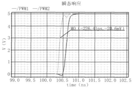 驅(qū)動(dòng)電路結(jié)構(gòu)如圖8 所示,該電路能有效調(diào)節(jié)死區(qū)時(shí)間(N 型、P 型功率開(kāi)關(guān)管同時(shí)關(guān)斷),防止單臂"shoot- through"現(xiàn)象,并有保護(hù)關(guān)斷功能。輸入信號(hào)為比較器輸出的PWM 脈沖信號(hào),PWM1用來(lái)驅(qū)動(dòng)N 型功率開(kāi)關(guān)管,PWM2 用來(lái)驅(qū)動(dòng)P 型功率開(kāi)關(guān)管。為了避免全橋開(kāi)關(guān)電路中的單臂"shoot- through"現(xiàn)象,當(dāng)PWM 信號(hào)從低電平變?yōu)楦唠娖綍r(shí),PWM2 應(yīng)首先變?yōu)楦唠娖剑?關(guān)斷PMOS 功率開(kāi)關(guān)管,隨后PWM1 再變?yōu)楦唠娖?,開(kāi)啟NMOS 功率開(kāi)關(guān)管,如圖9 所示;反之,當(dāng)PWM 信號(hào)從高變?yōu)榈蜁r(shí),PWM1 先變?yōu)榈碗娖?,關(guān)斷NMOS 開(kāi)關(guān)功率管,隨后PWM2 再變?yōu)榈碗娖?,開(kāi)啟PMOS 開(kāi)關(guān)功率管。實(shí)際電路中,可以根據(jù)需要通過(guò)控制延遲單元的控制位Tc 來(lái)調(diào)整死區(qū)時(shí)間的長(zhǎng)短。為減小失真,必須減小死區(qū)時(shí)間,該驅(qū)動(dòng)電路采用了逐級(jí)增加驅(qū)動(dòng)能力的方式來(lái)驅(qū)動(dòng)功率管,從而減小了必要的死區(qū)時(shí)間,保證了低失真度。