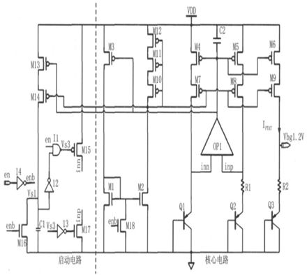 本文所設(shè)計(jì)的帶隙電壓基準(zhǔn)源結(jié)構(gòu)如圖10 所示,主要由核心電路與啟動(dòng)電路兩部分組成。