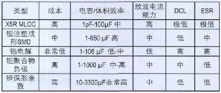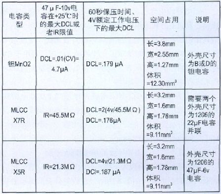 MLCC具有良好的低DCL特性,但在某些情況下,鉭電容能夠以更小的體積提供同樣低的DCL.表5 比較說(shuō)明了根據(jù)DCL要求正確評(píng)估和選擇合適的電容的計(jì)算方法。如表5所示,鉭電容一般按照DCL最大值來(lái)確定規(guī)格。標(biāo)準(zhǔn)二氧化錳 (MnO2)構(gòu)造的鉭電容在生產(chǎn)廠家處是按照 (。01xCV) 進(jìn)行分級(jí)的。某些電容生產(chǎn)廠家還會(huì)隨DCL信息提供具體的保壓時(shí)間,并且根據(jù)比同級(jí)別的DCL最大值低得多的具體DCL限值進(jìn)行電容器的預(yù)篩選。