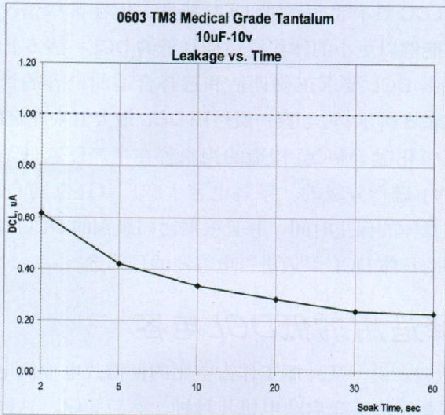 圖8是一種47uF-10V的鉭電容,雖然其最大DCL為4.7uA,根據(jù)特定的保壓時(shí)間篩選后,可為應(yīng)用提供超低DCL.以圖8的元件為例,該批量可以按照10秒鐘DCL 600nA的標(biāo)準(zhǔn)篩選,從而把總體 DCL 從 4.7uA 降至 600nA 限值。