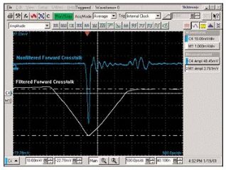 由于測量時來自80E04的輸入階躍電壓具有非常快的邊沿,因而得到的串擾過大,并不能代表實際邏輯電路中的驅(qū)動信號。例如,如果驅(qū)動信號來自一個1.5 ns的CMOS門,產(chǎn)生的串擾脈沖就更寬,幅度也更小。要使測量能夠體現(xiàn)出這種情況,可利用儀器的定義算法(Define Math)功能在信號捕獲之后增加一個低通濾波器。圖7中的M1波形(白色)給出的就是經(jīng)濾波后的測量結(jié)果。需要注意的是M1在垂直方向比未經(jīng)濾波的波形敏感10倍。