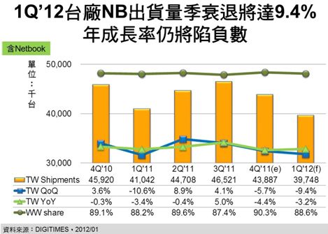 2012年第1季進入歐美傳統(tǒng)淡季,亞洲傳統(tǒng)旺季需求亦不甚熱絡,加上硬盤缺貨在1月最為嚴重,2月之后雖可逐月顯著改善,但英特爾(Intel)新CPU Ivy Bridge NB 4月上市在即,臺廠于3月即將開始大量出貨,致使1月硬盤未能滿足的舊CPU NB訂單將不具補單意義,進而造成臺廠NB出貨量將再較上季衰退9.4%。也由于全球景氣不振,NB市況持續(xù)低迷,DIGITIMES Research資深分析師兼主任簡佩萍預估,第1季臺廠NB出貨量將再較2011年同期衰退3.2%,致使連續(xù)兩年第1季臺廠NB出貨量年成長率均為負值。