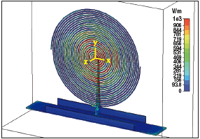 本例中使用的螺旋輻射結(jié)構(gòu)非常適于此種工作模式,但是不再需要與帶有吸收體的腔體連接使用。使用這種結(jié)構(gòu)可以創(chuàng)造兩種類型的天線:雙向結(jié)構(gòu),這種結(jié)構(gòu)允許螺旋天線自由地向空間中其平面法線的兩個(gè)方向輻射;或增益更高的單向結(jié)構(gòu),這種結(jié)構(gòu)中反射極緊靠螺旋天線使一個(gè)方向的輻射被反射回來,因此使前向增益增強(qiáng)。圖4給出了一個(gè)雙向螺旋天線。注意到其獨(dú)有特征可以擴(kuò)展頻率覆蓋范圍。圖5給出某同類型天線的電磁仿真。圖6給出類似這種雙向螺旋天線的輻射特性。