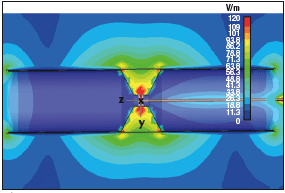 雙錐型天線被設(shè)計(jì)用來在大頻率范圍內(nèi)有效地工作。這種天線產(chǎn)生線性極化信號同時(shí)表現(xiàn)出極低的方位角波動,這意味著其多方向特征優(yōu)秀。這種結(jié)構(gòu)的有效帶寬處于兩倍頻程間,取決于可以容忍的輸入反射損耗。輸入反射損耗的影響受此結(jié)構(gòu)小型化程度決定,小型化的原因是選擇了圓錐到圓柱的傳輸區(qū)間,或完全使用圓錐區(qū)間。圖8和圖9分別給出了某雙錐天線及其電磁仿真結(jié)果。圖10給出了其測試性能,可以清晰地看到其方向角圖樣波動非常小。雖然在商業(yè)通信系統(tǒng)中,這些構(gòu)造的高功率處理能力并不總是很重要,但小巧的尺寸卻使其充滿吸引力。例如一種能覆蓋整個(gè)從800MHz到2.2GHz頻段的產(chǎn)品可以封裝在一個(gè)直徑32mm,長225mm的結(jié)構(gòu)中。雖然可以獲得更寬的帶寬,但必須在帶寬和直徑上折中選擇。較大的直徑會展寬天線工作頻率。這些天線構(gòu)造在非常寬的頻率范圍內(nèi)保持了其輻射圖樣特性,使它們適合微小區(qū)和微微小區(qū)的應(yīng)用。這樣的小區(qū)中使用天線放大信號(例如火車站)。擁有這種輻射圖樣的天線對于星形天線配置最有效。