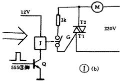 正確的方式見圖1b??煽毓枧c抽水電機(jī)組成抽水控制開關(guān),SCR的觸發(fā)由T2與G間接入電阻控制。當(dāng)水位降低時(shí),控制觸點(diǎn)開路,555第3腳輸出高電平(此電路部分省略),使Q導(dǎo)通,繼電器J吸合,SCR觸發(fā)導(dǎo)通,電機(jī)開始運(yùn)轉(zhuǎn)。當(dāng)水位達(dá)到時(shí), 觸點(diǎn)經(jīng)水接通,555第3腳輸出低電平,Q截止,SCR在交流電過零時(shí)截止,抽水停止。