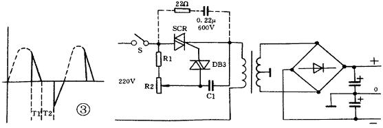 圖3是某電子雜志刊出的無級(jí)直流輸出調(diào)壓電路。原作者稱,利用Rc移相網(wǎng)路控制SCR的導(dǎo)通角改變變壓器初級(jí)的電流,從而獲得兩路連續(xù)可調(diào)的2x(0—17V) 的直流輸出電壓,負(fù)載電流為800mA 。很明顯,推薦電路(圖3)是普通移相式調(diào)功電路和降壓變壓器整流濾波電路的串聯(lián), 從基本原理分析,似乎無大的原則問題。變壓器初級(jí)每半周電流有效值隨可控硅導(dǎo)通角變化,次級(jí)輸出電壓的峰值、平均電流值都隨之而變。當(dāng)然,一定負(fù)載時(shí)輸出整流電壓也必然改變。本人看后,極感興趣,依此原理制作了一臺(tái)輸出100±40V范圍變化的維修代用直流電源,并依照?qǐng)D中虛線加入RC吸收回路。實(shí)驗(yàn)時(shí),該電路一接入電源,距此10米遠(yuǎn)的電視機(jī)屏幕上即出現(xiàn)兩條緩慢移動(dòng)的黑帶(從鄰居的責(zé)問中得知),同時(shí),空載下不到十分鐘,SCR即擊穿。更不能容忍的是,降壓變壓器鐵心發(fā)出拖拉機(jī)啟動(dòng)時(shí)的聲音,室內(nèi)電度表也發(fā)出同樣的聲音,而且,隨著輸出電壓的調(diào)低,聲音更大。