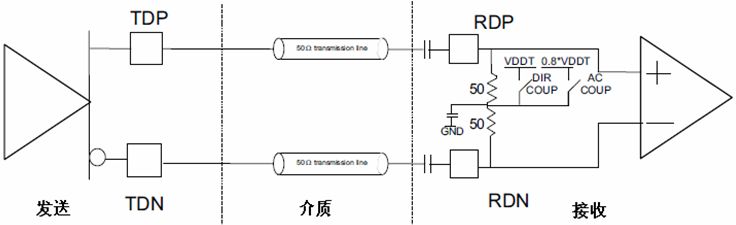 圖3是TLK3132高速串行接口的AC耦合框圖,采用CML高速電平接口,發(fā)送側(cè)內(nèi)部集成了50歐姆的匹配電阻。接收端支持DC和AC耦合,若采用直流耦合時,共模電壓由發(fā)送側(cè)決定,匹配電阻直接上拉到VDDT,若采用交流耦合,為得到最優(yōu)的共模偏置電壓,選擇芯片內(nèi)部0.8VDDT的偏置電壓。在實(shí)際電路設(shè)計(jì)中,推薦采用交流耦合方式,容易實(shí)現(xiàn)不同接口的電平轉(zhuǎn)換,并可去除共模噪聲,避免外界噪聲對接收端的影響。