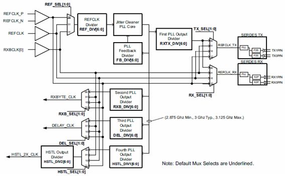 SERDES實(shí)現(xiàn)的一個關(guān)鍵技術(shù)是時鐘的產(chǎn)生和分布,圖5是TLK3132芯片內(nèi)部的時鐘架構(gòu)。時鐘配置非常靈活,支持單端或差分參考時鐘輸入,同時包括多個高頻鎖相環(huán)電路: