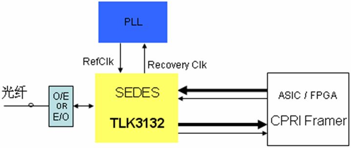 為了處理射頻模塊拉遠(yuǎn)技術(shù)中基帶單元和射頻單元的光纖鏈接,國際上成立兩個標(biāo)準(zhǔn)化組織:一個是CPRI (Common Public Radio Interface),在2003年由華為、愛立信、NEC、西門子和北電發(fā)起成立的組織,致力于基帶、射頻接口的標(biāo)準(zhǔn)化;另一個是OBSAI (Open Base Station Architecture Initiative),由諾基亞、LG電子、三星電子等成立的聯(lián)盟。二者都定義了使基帶和射頻分離的標(biāo)準(zhǔn)化接口,也就是將宏基站分為基帶單元BBU和遠(yuǎn)端射頻單元RRU兩部分,BBU和RRU之間傳送I/Q數(shù)據(jù)和控制管理數(shù)據(jù),其信號格式就是CPRI或者OBSAI所定義的標(biāo)準(zhǔn)接口。本文以CPRI接口為例,詳解TLK3132在射頻模塊拉遠(yuǎn)技術(shù)中的應(yīng)用。