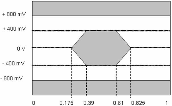 在高速數(shù)據(jù)鏈路通信中,抖動指標(biāo)是非常關(guān)鍵的,CPRI接口相應(yīng)推薦了高速串行信號的眼圖和抖動規(guī)格。在SERDES發(fā)送側(cè),CPRI要求的眼圖模板如圖8所示。
