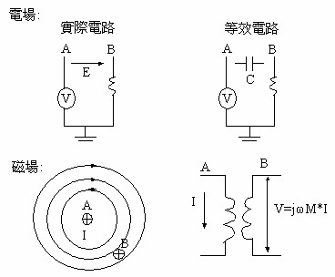 就Maxwell方程式的大多數(shù)應用而言,噪聲耦合方法可以代表等效組件的模型。例如:在兩個導體之間的一個時變電場,可以代表一個電容。在相同的兩導體之間,一個時變磁場可以代表互感(mutual inductance)。附圖二表示這兩種噪聲耦合機制。