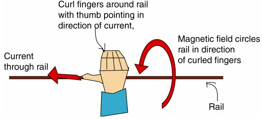 根據(jù)Maxwell方程式,移動走線中的電荷可以產生一電流,此電流又會產生一磁場,這種被移動電荷產生的磁場稱作「磁通線(magnetic lines of flux)」。使用「右手法則(Right-Hand Rule)」可以輕易地指出磁通線的方向,如附圖四所示。右手拇指代表走線電流流動的方向,其余卷曲的手指包圍著走線,代表磁場或磁通線的方向。此外,時變磁場會產生一個垂直的電場。射頻輻射是此磁場和電場的組合。藉由輻射或導電的方式,磁場和電場會離開PCB結構。