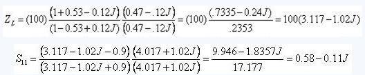 舉個(gè)例子,用100歐姆阻抗表征的復(fù)合回波損耗S11=0.53-0.12J轉(zhuǎn)換到90歐姆的如下: