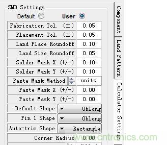 4、點(diǎn)擊Calculator Settings(豎排字),選User將Solder Mask X及Y改為0.1(一般阻焊層比焊盤(pán)大0.1mm)