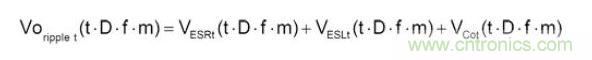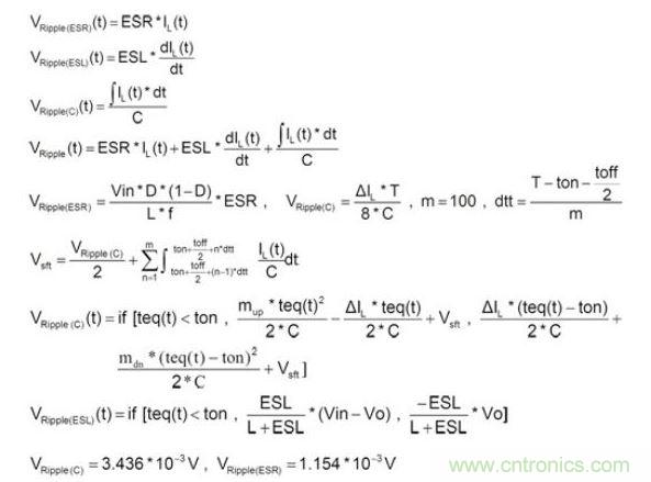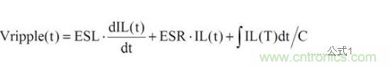 一般而言,在穩(wěn)態(tài)(Steady State)及負載固定時,輸出電容的紋波電壓主要是由電感的紋波電流造成,可先計算出電感的紋波電流,再利用歐姆定律,電感微分公式及電容電荷儲存公式,分別計算出ESR、ESL及Capacitance的紋波電壓。再將此三種紋波加總起來,便可得輸出電容的紋波電壓,如公式1所示: