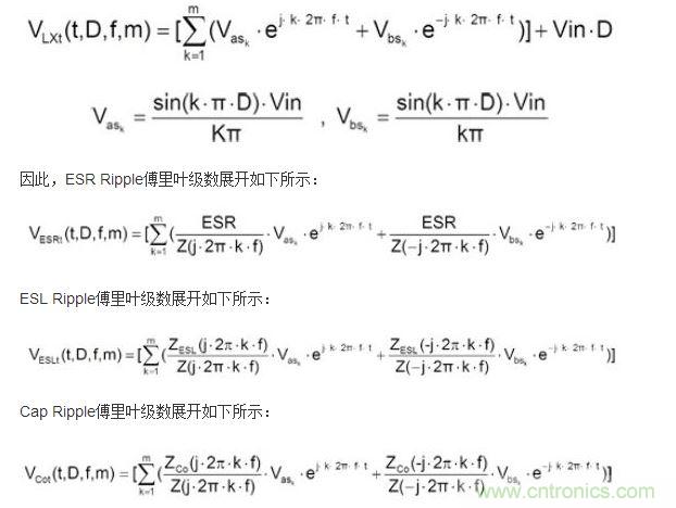 基于此因素,本文將以傅里葉函數(shù)(Fourier Series Expansion)方式來探討同步交換式降壓轉(zhuǎn)換器(Synchronous Step Down Converter)輸出電壓紋波的波形,并依電容完整等效串聯(lián)電阻(ESR)、等效串聯(lián)電感(ESL)、電容值(Capacitance)對應的公式,經(jīng)由理論推導,有效地分析電源模塊輸出端紋波成分。