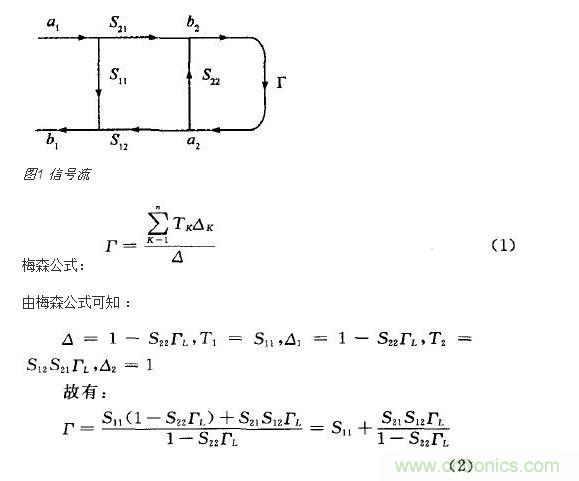信號流圖(如圖1所示)結(jié)合散射參數(shù)是分析微波網(wǎng)絡(luò)和微波測量系統(tǒng)的簡便有效方法。流圖公式亦稱梅森不接觸環(huán)法則(Mason’s non-touching loop rule),簡稱梅森公式。根據(jù)梅森公式可以直接求出信號流圖中任意兩點之間的傳輸值。