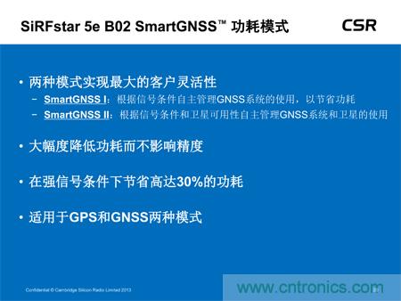 可穿戴設(shè)備應(yīng)用。該低功耗器件現(xiàn)已全面投入生產(chǎn),不僅可大幅度降低功耗且不影響定位精度,還可提供多衛(wèi)星GNSS支持,可滿足所有地區(qū)對GNSS的需求,包括美國的GPS、歐洲的伽利略、俄國的Glonass及中國的北斗衛(wèi)星系統(tǒng)。此外,SiRFstar 5e B02還搭載了CSR全新的SmartGNSS技術(shù),可提供兩種模式最大程度地降低功耗,并能夠根據(jù)信號條件及衛(wèi)星可用性自主管理GNSS系統(tǒng)的應(yīng)用。