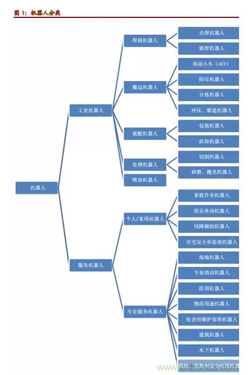 機器人專家從機器人應(yīng)用環(huán)境出發(fā),將機器人分為兩大類,即工業(yè)機器人和服務(wù)機器人。工業(yè)機器人根據(jù)用途不同,大致可以分為焊接機器人、搬運機器人、噴漆機器人、涂膠機器人、裝配機器人、碼垛機器人、切割機器人、自動牽引車(AGV)機器人、凈室機器人等。而服務(wù)機器人則是除工業(yè)機器人之外的、用于非制造業(yè)并服務(wù)于人類的各種先進機器人,主要包括個人/家用服務(wù)機器人和專業(yè)服務(wù)機器人。其中,個人/家用機器人主要包括:家庭作業(yè)機器人、娛樂休閑機器人、殘障輔助機器人、住宅安全和監(jiān)視機器人等;專業(yè)服務(wù)機器人主要包括:場地機器人、專業(yè)清潔機器人、醫(yī)用機器人、物流用途機器人、檢查和維護保養(yǎng)機器人、建筑機器人、水下機器人,以及國防、營救和安全應(yīng)用機器人等等。