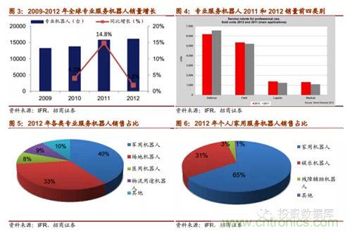 根據(jù)IFR2013年世界服務(wù)機器人統(tǒng)計報告,服務(wù)機器人2012年總銷量為301.6萬臺,總銷售額為46.2億美元。其中個人/家用服務(wù)機器人銷量為300萬臺,環(huán)比上升20%,總銷售額為12億美元;專業(yè)服務(wù)機器人2012年總銷量為16067臺,環(huán)比增長2%,銷售額為34.2億美元。