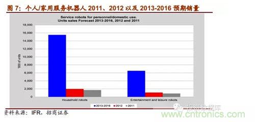 IFR報告預(yù)期,從2013年到2016年,全球工業(yè)機器人市場將以年均6%的速度增長,中國是這一增長趨勢的領(lǐng)跑者,年均增長率達15%。根據(jù)marketsandmarkets的報告,2011年全球服務(wù)機器人市場規(guī)模為183.9億美元,到2012年增長到207.3億美元,計2012-2017年全球服務(wù)機器人市場規(guī)模復(fù)合增速將達到17.4%,到2017年達到461.8億美元。對于專業(yè)服務(wù)機器,IFR預(yù)測2013-2016年估計有94800臺專業(yè)服務(wù)機器人會得到安裝使用,銷售額達171億美元。其中軍用機器人銷量約達28000臺;場地機器人中的擠奶機器人銷量估計為24500臺。兩者占總專業(yè)服務(wù)機器人銷量55%。