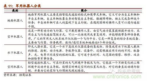 (五)軍事機器人是21世紀各國軍事安全重點戰(zhàn)略:蒂爾集團稱未來10年全球無人機研發(fā)投入和采購需求將達到940億美元。軍用機器人強國包括美德英法意以日韓,這些國家不僅在技術(shù)處于研究的先列,其產(chǎn)品已經(jīng)在軍事上有了實際運用;我國與這些強國的技術(shù)差距明顯,受政策支持,軍事機器人相關(guān)企業(yè)發(fā)展前景明顯良好,可能成為企業(yè)未來強勁的收入保證。