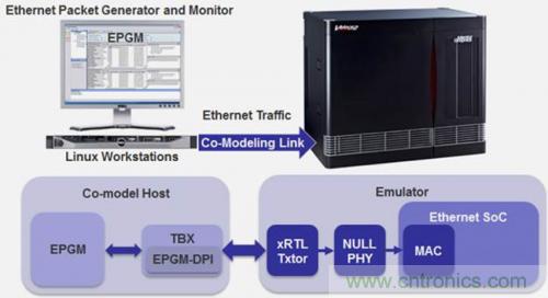 在此場景中,以太網(wǎng)測試儀模型運行于連接到硬件仿真器的Linux工作站上?;诔墒斓膶崿F(xiàn) IP,模型準(zhǔn)確再現(xiàn)了實際的物理測試儀。這種虛擬測試儀包括以太網(wǎng)數(shù)據(jù)包生成器和監(jiān)視器 (EPGM),可以為 1G、10G、40G/100G 和 120G 網(wǎng)絡(luò)分別配置 GMII、XGMII、XLGMII/CGMII 和 CXGMII 接口。每個支持的MII端口都需要一個 xRTL 事務(wù)處理器(圖 2)。