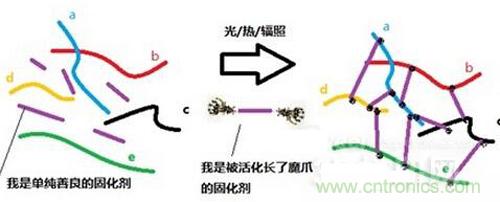 在圖中,小a、小b、小c等等是一群活潑的聚合物分子,因?yàn)檫@些鏈狀的分子之間很容易相互移動(dòng),所以看上去是一灘黏黏的液體(有時(shí)候可能粘度很大,比如硫化前的天然橡膠,它從樹(shù)上滴下來(lái)的速度非常緩慢)。有一天惡魔把一把單純善良的固化劑混進(jìn)了小兄弟里面,小兄弟活潑依舊,絲毫沒(méi)有發(fā)現(xiàn)危險(xiǎn)的存在。突然有一天惡魔把這灘小兄弟連固化劑一起放進(jìn)了高溫高壓的一個(gè)東西里面(一般稱(chēng)為硫化機(jī)/熱壓機(jī)),然后看似無(wú)害的固化劑長(zhǎng)出了魔爪,死死抓住了小兄弟們,一個(gè)又一個(gè)的魔爪分別抓住不同的兄弟們,產(chǎn)生了很多交聯(lián)結(jié)構(gòu),即使沒(méi)有了高溫高壓也不會(huì)再放開(kāi)。最后小兄弟們?cè)僖膊荒茈S便活動(dòng)了,這灘液體也變成了硬硬的一塊——這就是固化過(guò)程的通(dou)俗(bi)解釋。當(dāng)然也有些固化劑的固化原理是引發(fā)小分子聚合物上的基團(tuán)相互反應(yīng)的,這種一般被稱(chēng)為引發(fā)劑。