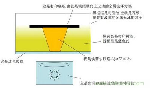 簡(jiǎn)單來(lái)說(shuō),立體光固化的過(guò)程就是光照射光敏樹(shù)脂表面,使其固化成薄薄的一層固體,已經(jīng)固化完成的部分被一塊基板黏附著,逐漸與光照射面拉開(kāi)一定距離(通常是每次移動(dòng)十幾個(gè)微米),然后在上一層固化樹(shù)脂的基礎(chǔ)上再進(jìn)行下一層的照射和固化。經(jīng)過(guò)層層固化疊加之后,最終就形成一個(gè)完整的立體結(jié)構(gòu)。下面這張圖表示的就是SLA設(shè)備的基本結(jié)構(gòu),固化反應(yīng)發(fā)生在打印樹(shù)脂與透光玻璃板的交界面上,由于光照射面在液面的下方,打印的過(guò)程看上去就像從液體里“拉”出了打印制件一樣。