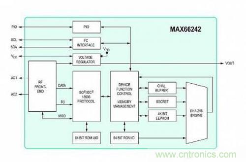 幾種功能對(duì)于無(wú)線NFC/RFID應(yīng)用非常重要:集成到無(wú)源標(biāo)簽認(rèn)證器的高級(jí)安全性(圖2)、集成無(wú)線NFC/RFID接口和I?C接口、數(shù)據(jù)保護(hù)模式、高速數(shù)據(jù)傳輸、標(biāo)簽?zāi)芰渴占?;MAX66242集成了SHA-256加密引擎,提供基于安全密鑰的對(duì)稱式質(zhì)詢-應(yīng)答安全認(rèn)證。是控制NFC/RFID讀卡器與那些設(shè)備通信,以及如何與MAX66242通信的最好途徑。32字節(jié)SRAM緩存器有利于通過(guò)I?C接口進(jìn)行高速數(shù)據(jù)傳輸。標(biāo)簽上的能量收集引腳VOUT使其利用天線從讀卡器的HF場(chǎng)收集能量。