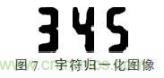 得到字符在圖像中的位置后,即可將字符從圖像中分割出來。由于實(shí)際分割過程中每個(gè)字符大小不一致,如圖6所示,所以對分割字符進(jìn)行歸一化處理,使不同字符的大小統(tǒng)一為固定大小,便于后續(xù)字符分割。首先將圖6中字符周圍的空白位置切除,然后采用三次樣條插值的方法,對源圖像附近的4×4個(gè)鄰近像素進(jìn)行三次樣條擬合,最后將目標(biāo)像素對應(yīng)的三次樣條值作為目標(biāo)圖像對應(yīng)像素點(diǎn)的值。將字符歸一化以后,所得各個(gè)字符如下圖7所示。
