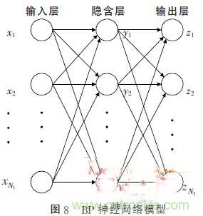 三層BP神經(jīng)網(wǎng)絡(luò)的模型如圖8所示,包括輸入層、隱含層和輸出層,各層間由連接權(quán)值構(gòu)成。BP神經(jīng)網(wǎng)絡(luò)的訓(xùn)練過程由信號的正向傳播和誤差的反向傳播兩個(gè)過程組成,其學(xué)習(xí)的本質(zhì)是各連接權(quán)值的動(dòng)態(tài)調(diào)整。隨著網(wǎng)絡(luò)的不斷學(xué)習(xí),權(quán)值也不斷的調(diào)整,直到誤差減少到可接受的程度或者訓(xùn)練達(dá)到預(yù)定的訓(xùn)練次數(shù)。