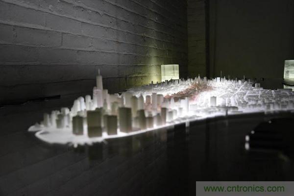 這些城市街區(qū)是用3ds Max和Rhino軟件設計之后,再用能夠在黑暗中發(fā)光的半透明線材3D打印的。這其中的每個模型都經過了精心設計使之盡可能地與真實保持一致。除此之外,Huang還會偶爾在個別細部的地方秀一下自己的幽默感,比如他就3D打印了一個金剛并將其放到了自由塔上。