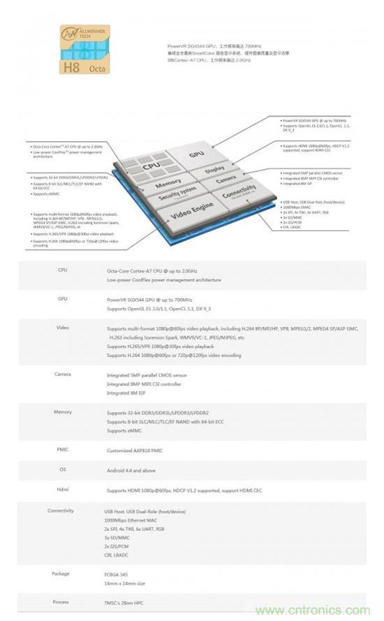 多媒體方面, H8支持多格式1080p@60fps視頻編解碼, 支持H.265/HEVC視頻處理,集成8M ISP圖像信號(hào)處理架構(gòu),可支持800萬像素?cái)z像頭。 顯示方面,H8支持HDMI 1080p@60fps顯示,支持HDCP V1.2協(xié)議,支持HDMI CEC。此外,H8集成了全志新一代麗色顯示技術(shù),圖像顯示質(zhì)量進(jìn)一步提升。事實(shí)上,H8芯片最早是應(yīng)用于電視盒子。
