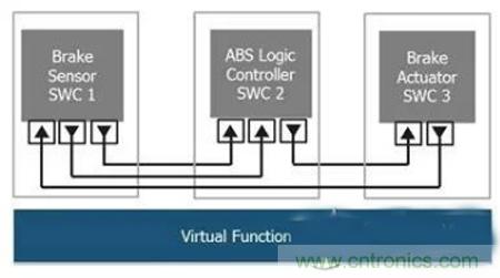 將設計與硬件決策分開使車輛生產(chǎn)商/OEM能夠依據(jù)所需的車輛功能進行自上而下的設計。存在于這個設計時間的虛擬功能總線(VFB)概念讓所有軟件電子控制單元都能夠實現(xiàn)互連和獲得測試。這讓設計人員可專注于應用層,而不是根本的軟件基礎建設。通過采用虛擬功能總線,應用軟件組件(SWC)與其它應用軟件組件也相互獨立。軟件組件向虛擬功能總線發(fā)出輸出信號,虛擬功能總線再將信息傳送給目標組件的輸入埠。AUTOSAR定義了輸入和輸出端口,以及交換信息的格式。這種抽離式的(abstracted)方法使得在定義相關硬件之前可實現(xiàn)所有車輛軟件功能和接口交互驗證。設計調整也因此變得容易得多,同時所有功能都被定義成虛擬功能總線上的軟件組件(圖2)。