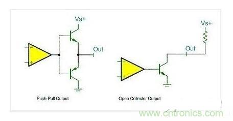 關(guān)于推挽輸出和開漏輸出,最后用一幅最簡(jiǎn)單的圖形來概括:該圖中左邊的便是推挽輸出模式,其中比較器輸出高電平時(shí)下面的PNP三極管截止,而上面NPN三極管導(dǎo)通,輸出電平VS+;當(dāng)比較器輸出低電平時(shí)則恰恰相反,PNP三極管導(dǎo)通,輸出和地相連,為低電平。右邊的則可以理解為開漏輸出形式,需要接上拉。