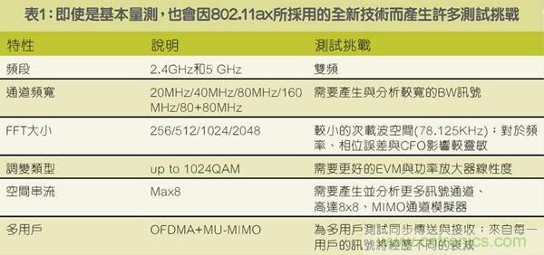 表1:即使是基本量測,也會(huì)因802.11ax所采用的全新技術(shù)而產(chǎn)生許多測試挑戰(zhàn)