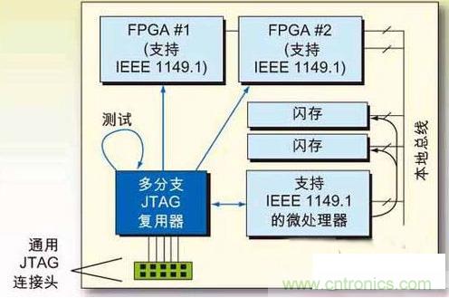 圖1:第二代JTAG應(yīng)用:利用JTAG多支路復(fù)用器簡(jiǎn)化對(duì)多個(gè)JTAG鏈的接入。