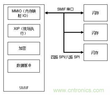 SMIF 允許用戶配置多個相同或不同類型和大小的存儲設(shè)備。在內(nèi)存(XIP)模式下,多個內(nèi)存設(shè)備被映射到不同的地址。它們可以是不同類型和用途的存儲器,也可以是在連續(xù)地址空間中配置以模擬連續(xù)大存儲器的相同存儲器設(shè)備。SMIF 外設(shè)和 SPI 閃存的組合使用可以替代外部 NAND 和 NOR 閃存,并且可以節(jié)省電路板空間。由于串行閃存直接映射到處理器的內(nèi)存空間數(shù)據(jù)存儲中并且支持 XIP 的執(zhí)行,所以其易用性高于 NAND 內(nèi)存。