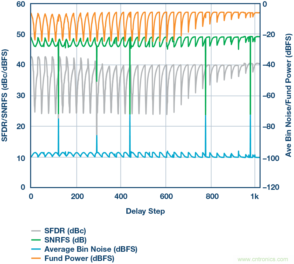 結(jié)果如圖3a所示,基波功率、SFDR和SNR將隨所應(yīng)用的每個(gè)設(shè)置而變化。如圖所示,當(dāng)把采樣位置放在更好的地方(THA將樣本送至ADC的過程之中)時(shí),基波功率將處于最高水平,而SFDR應(yīng)處于最佳性能(即最低)。圖3b為延遲映射掃描的放大視圖,延遲設(shè)定點(diǎn)為671,即延遲應(yīng)該保持固定于此窗口/位置。請記住,延遲映射程序僅對系統(tǒng)的相關(guān)采樣頻率有效,如果設(shè)計(jì)需要不同的采樣時(shí)鐘,則需要重新掃描。本例中,采樣頻率為4 GHz,這是該信號(hào)鏈中使用的THA器件的最高采樣頻率。