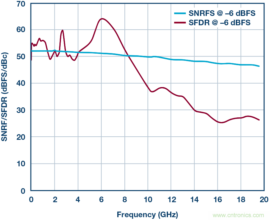 圖6. –6 dBFS時(shí)的SNRFS/SFDR性能結(jié)果。