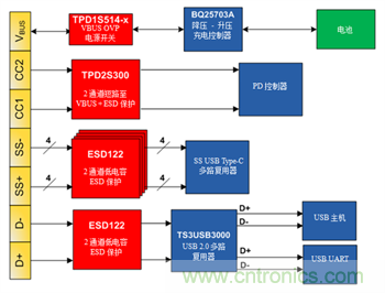 您可將TPD2S300與其他保護(hù)裝置(如TPD1S514(過壓+沖擊+VBUS的ESD保護(hù))和ESD122 (雙通道低電容ESD保護(hù)))配對(duì),為USB Type-C連接器提供一體式解決方案(圖2)。