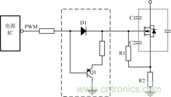 如果選擇MOS管寄生電容比較大,電源IC內(nèi)部的驅(qū)動能力又不足時,需要在驅(qū)動電路上增強驅(qū)動能力,常使用圖騰柱電路增加電源IC驅(qū)動能力,其電路如圖 2虛線框所示。