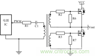 為了滿足如圖 5所示高端MOS管的驅(qū)動,經(jīng)常會采用變壓器驅(qū)動,有時為了滿足安全隔離也使用變壓器驅(qū)動。其中R1目的是抑制PCB板上寄生的電感與C1形成LC振蕩,C1的目的是隔開直流,通過交流,同時也能防止磁芯飽和。