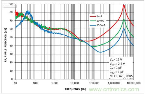 b)輸入電壓的快速變化(通常是由DC-DC轉(zhuǎn)換器的輸出電壓紋波引起的)無法通過控制回路完全過濾,于是輸入電壓的變化會一定程度地反映在輸出電壓中,該參數(shù)稱為電源抑制比(PSRR),且通常是頻變參數(shù)。一些制造商標(biāo)示的PSRR為負(fù)數(shù),有些則為正數(shù)。一般而言,PSRR絕對值越高,從輸入到輸出的傳輸干擾信號就越少。通常情況下,受到干擾的輸入電壓會以mV或更低的單位級別傳輸至輸出端。相似地,輸入電壓的快速變化(即“線路瞬態(tài)響應(yīng)”)可發(fā)生于LDO輸出端。